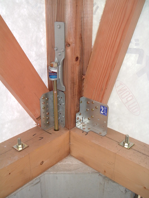 上棟直後 頑丈な骨組み 土台はヒバ、柱は杉、梁は米松