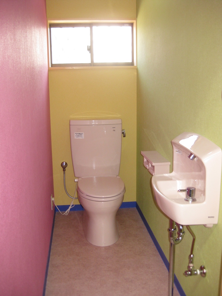 手洗い器は子供たちが使いやすい高さを考慮して、標準よりも少し下げて取り付けしました。